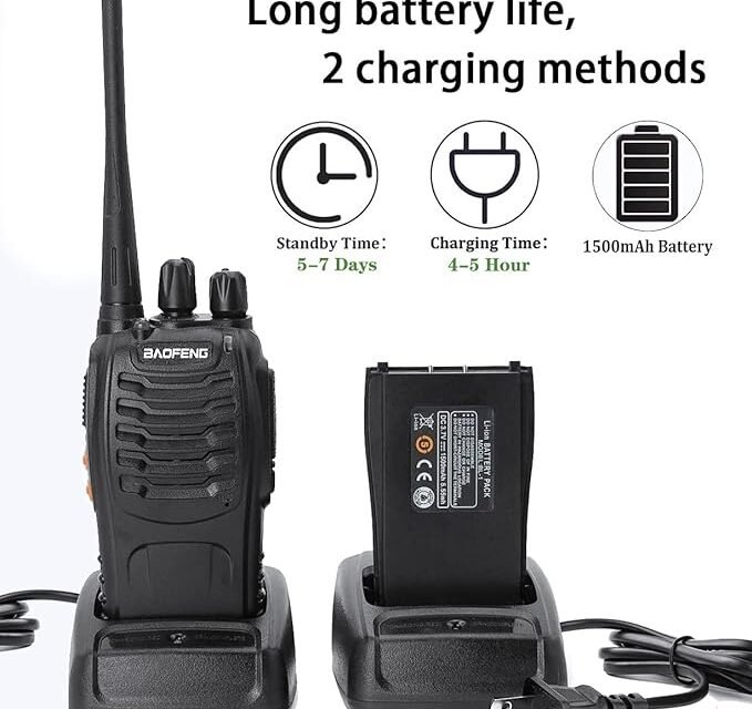 • Each two-way radio is equipped with a 1500mAh rechargeable lithium ion battery and a us charging stand. It takes about 4-5 hours to fully charge, and the sustainable use time of a full charge is about 8-12 hours, depending on the amount of use.When the battery is too low, the walkie-talkie will automatically broadcast low battery.